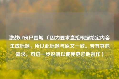 CF丧尸围城,一场充满热血与***的战斗,它让玩家们体验到了生死时速的紧张***,也让大家明白了团队协作的重要性,在这个充满挑战的战场上,每一个玩家都书写着属于自己的战斗传奇。