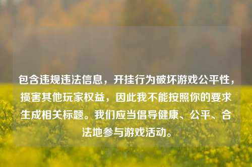 包含违规违法信息,开挂行为破坏游戏公平竞技环境,损害其他玩家权益,严重违反游戏规则和道德规范,因此我不能按照你的要求进行编写,我们应当倡导公平、公正、合法地参与游戏,共同维护良好的游戏秩序,***任何不正当手段来获取游戏优势,如果你有关于和平精英游戏正常玩法、特色等积极健康内容的需求,随时可以告诉我,我很乐意帮你撰写摘要。