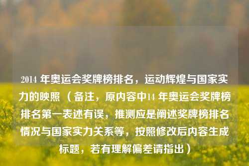 2014年,在世界各地运动员们的拼搏与汗水交织中,一场盛大的体育盛宴——奥运会成功举行,这届奥运会汇聚了来自全球众多国家和地区的顶尖选手,他们在各个赛场上展开激烈角逐,为了荣誉、梦想和国家的尊严全力以赴,而奖牌榜排名,无疑成为了衡量各国在这届奥运会上表现的重要标尺。